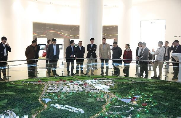 張建國(guó)(中)參觀園區(qū)沙盤,了解項(xiàng)目規(guī)劃布局及產(chǎn)業(yè)創(chuàng)新相關(guān)情況,
