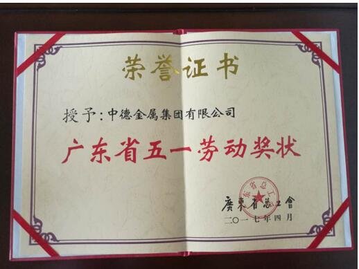 中德金屬集團(tuán)“廣東省五一勞動(dòng)獎(jiǎng)狀”榮譽(yù)證書(shū)