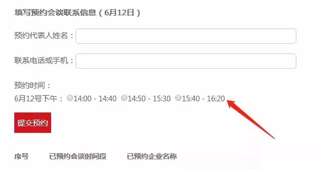 3.進入外資企業(yè)信息界面,填寫預約會談聯(lián)系信息,選擇6月12日預約會談的時間段,然后提交預約即可。