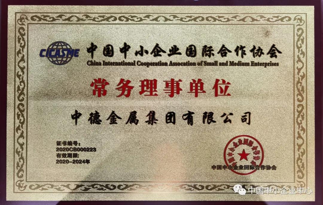 憑借在助推中小企業(yè)對外合作和創(chuàng)新發(fā)展方面的不懈努力和突出成績,中德金屬集團獲選中國中小企業(yè)國際合作協(xié)會常務(wù)理事單位,這是國家級行業(yè)協(xié)會對中德金屬集團服務(wù)中歐中小企業(yè)雙向合作工作的高度認(rèn)可,也是對集團在中小企業(yè)創(chuàng)新發(fā)展工作中突出貢獻(xiàn)的充分肯定,意味著中德金屬集團將更好地為國內(nèi)中小企業(yè)提供更大的合作平臺和海內(nèi)外資源。