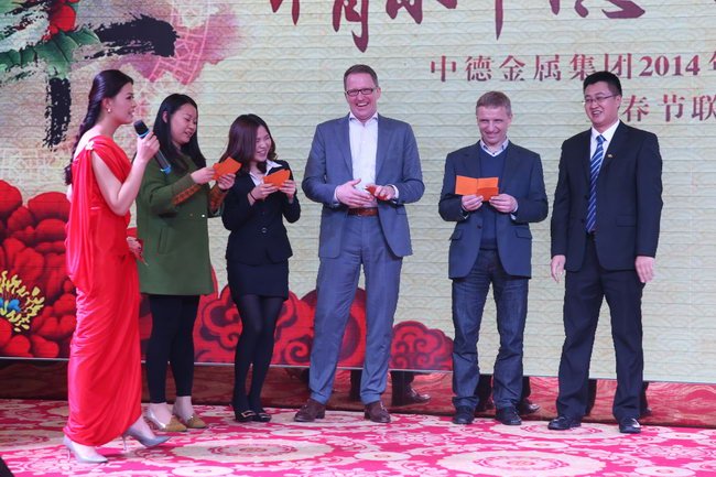 駿馬騰飛成壯舉,靈羊起步赴新程。2015年2月12日,中德金屬集團(tuán)在榕江大酒店舉辦了以“情系中德·執(zhí)夢(mèng)遠(yuǎn)航”為主題的2014年度總結(jié)表彰大會(huì)暨春節(jié)聯(lián)歡晚會(huì)。德國(guó)歐綠保集團(tuán)董事會(huì)成員、集團(tuán)COO、綠色燃料合資公司董事馬丁·貝克雷特曼(Martin Becker-Rethmann)、艾薩醫(yī)療技術(shù)公司總經(jīng)理邵愛民等外國(guó)嘉賓應(yīng)邀參加此次盛會(huì),與集團(tuán)領(lǐng)導(dǎo)以及全體公司員工共度了一個(gè)難忘而美好的夜晚。