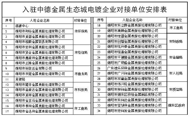為進一步加大對入園電鍍企業(yè)幫扶力度,我市環(huán)保、經信、商務部門和揭東區(qū)政府等十家單位將對首批34家進駐中德金屬生態(tài)城表面處理生態(tài)工業(yè)園電鍍企業(yè)進行結對支持,確保企業(yè)早日投產運營,推動電鍍園區(qū)加快建設,努力打造綠色電鍍產業(yè)高地。