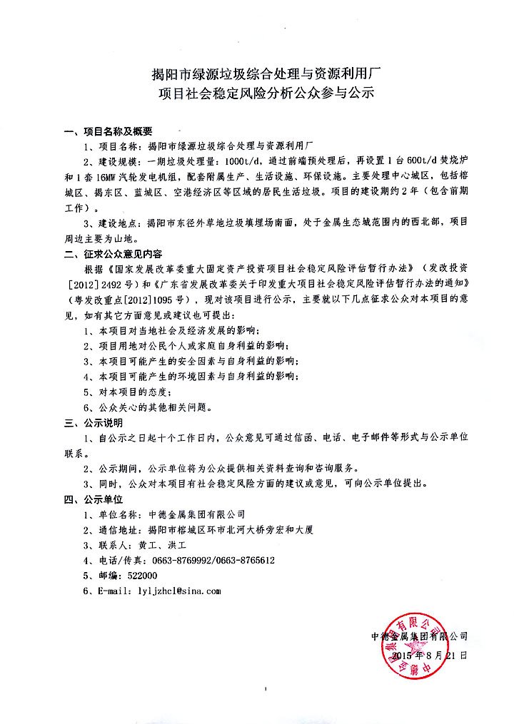 揭陽市綠源垃圾綜合處理與資源利用廠項目社會穩(wěn)定風(fēng)險分析公眾參與公示