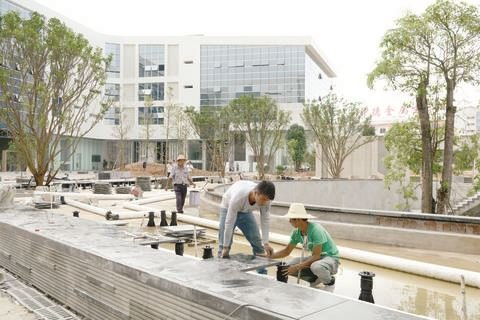 鋪貼石板、種植綠化、修筑景觀水池……國慶期間,中德金屬生態(tài)城四大中心工程中庭園林施工現(xiàn)場一派繁忙,工人有條不紊地推進(jìn)各項(xiàng)施工。