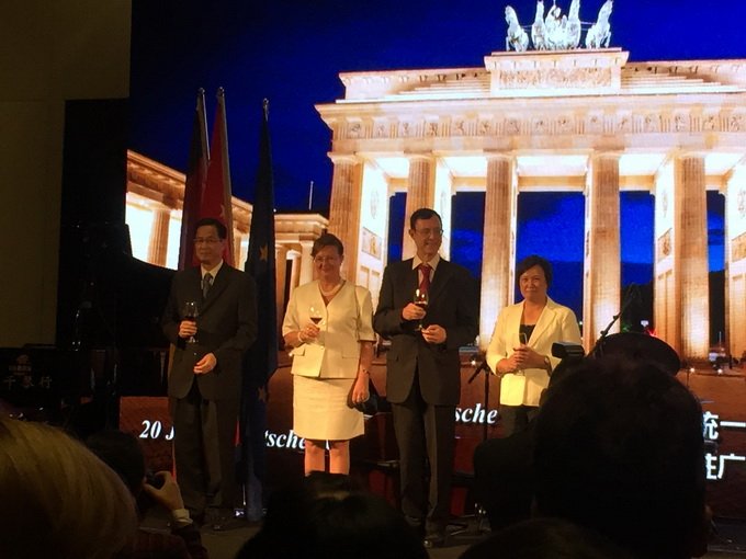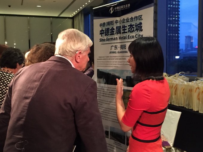 10月12日,受德國(guó)駐廣州領(lǐng)事館的邀請(qǐng),中德金屬集團(tuán)副總裁晉衛(wèi)東攜集團(tuán)招商、營(yíng)銷等部門主要人員參加了德國(guó)統(tǒng)一25周年德國(guó)國(guó)慶日活動(dòng);顒(dòng)現(xiàn)場(chǎng)來自中德兩國(guó)的各個(gè)協(xié)會(huì)、機(jī)構(gòu)及企業(yè)代表借藝術(shù)形式進(jìn)行商務(wù)、文化交流。作為華南區(qū)首個(gè)中德中小企業(yè)合作區(qū),中德金屬生態(tài)城項(xiàng)目一直以來得到了德國(guó)駐廣州總領(lǐng)館的大力支持。呂海慕總領(lǐng)事在致辭中提出,希望能進(jìn)一步促進(jìn)中德之間的合作,對(duì)揭陽的中德合作成果表示充分肯定。廣東省政府副秘書長(zhǎng)羅娟參加了活動(dòng)并致辭,她提出,廣東省政府將繼續(xù)支持中德金屬生態(tài)城這一中德合作平臺(tái),促進(jìn)廣東與德國(guó)的合作。