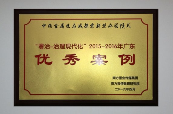 2016年4月26日,第三屆“粵治一治現(xiàn)代化”廣東探索經(jīng)驗(yàn)交流會(huì)在南方報(bào)經(jīng)業(yè)傳媒集團(tuán)舉行。在同時(shí)發(fā)布的2015-2016年度“粵治——治理現(xiàn)代化”優(yōu)秀案例中,來自廣東揭陽的中德金屬生態(tài)城榜上有名。